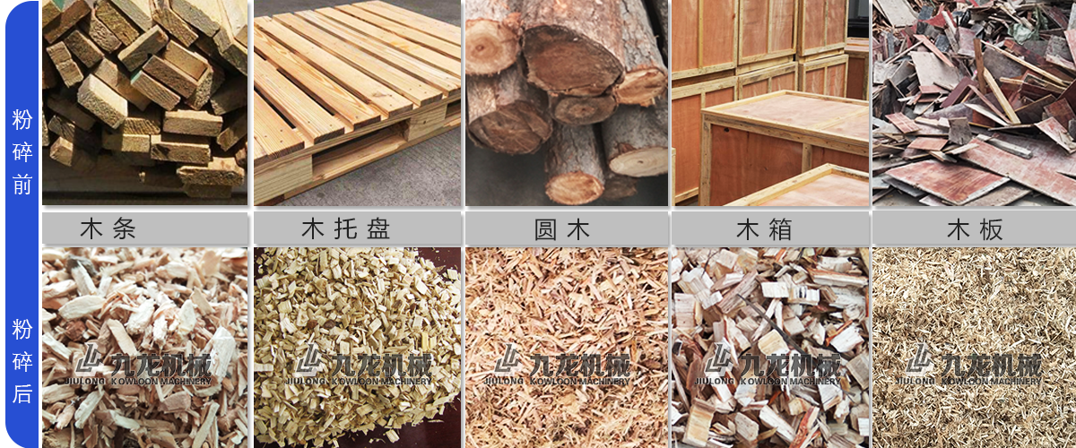 各種廢舊木材、板材料、木托盤、下腳料、舊家具、木板、木箱等。現在粉碎木材和農作物的人越來越多,木材破碎后可以應用在電廠發電,制作香行業、能源棒的生產和菌菇生產養殖等等不同的領域。